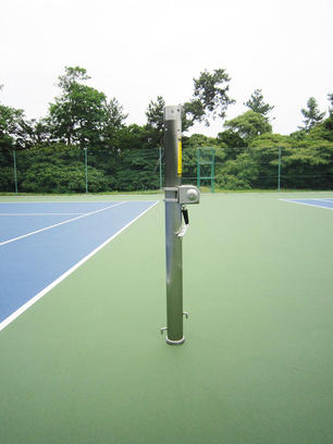福岡県のテニスコートに設置されたATP丸型テニスネットポスト。