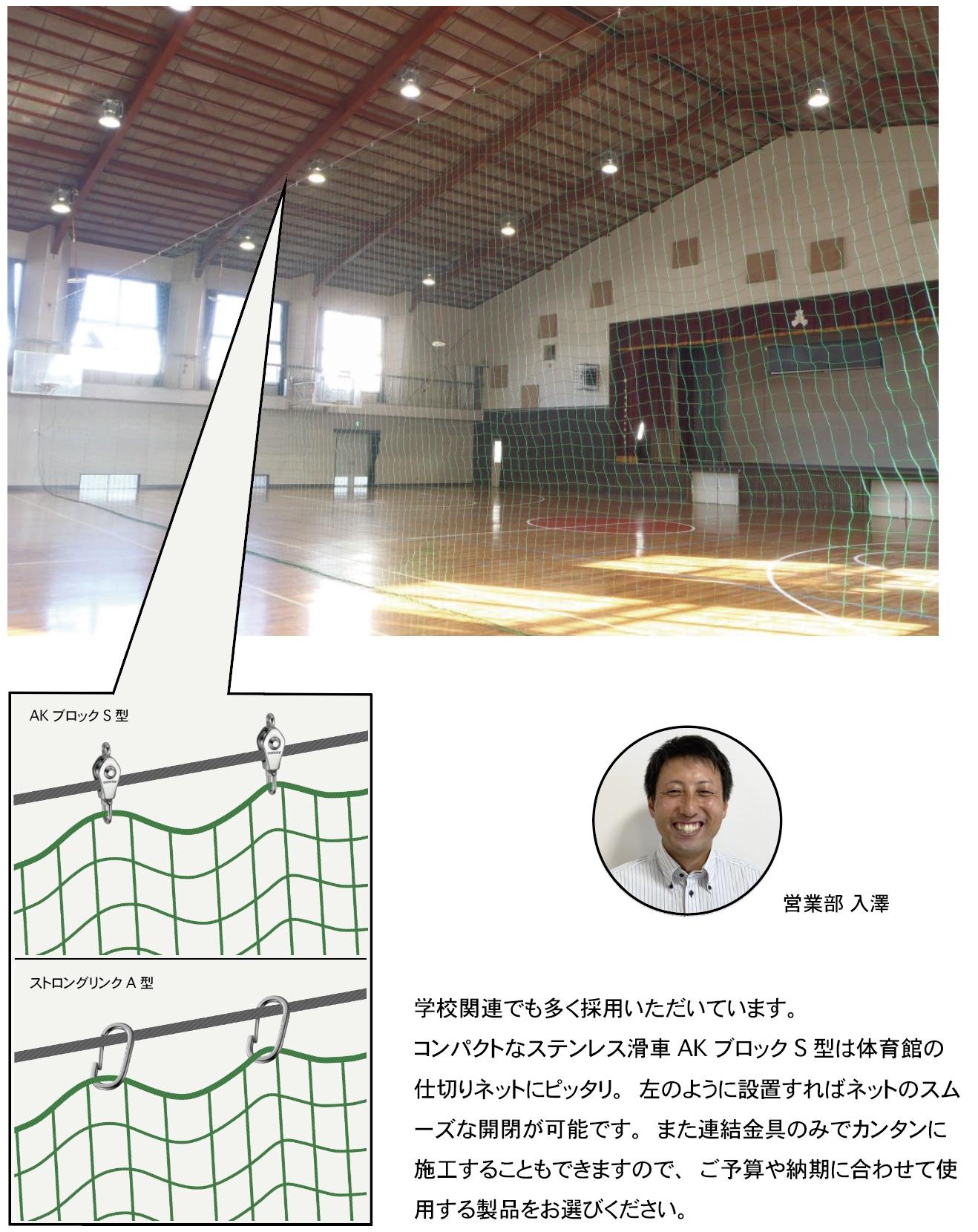 体育館やグラウンドなどの学校設備にある「防球(仕切り)ネット」の設置にはASANOの滑車や連結金具が非常に便利です。