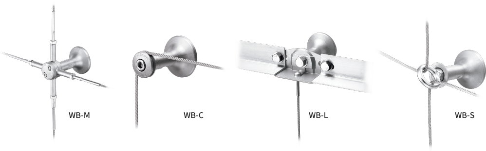 上下左右、斜め方向にも展開可能なWB-M、ワイヤーをクリップするだけで、1 本のワイヤーを連続して張設できるWB-C、アングルを使用し、ワイヤーを効率的に張ることができるWB-L、アイボルトの使用で簡易的な取付けを可能にしたWB-S と、設置場所、範囲、規模など様々なシチュエーションに対応できる豊富な製品バリエーションを取り揃えています。
