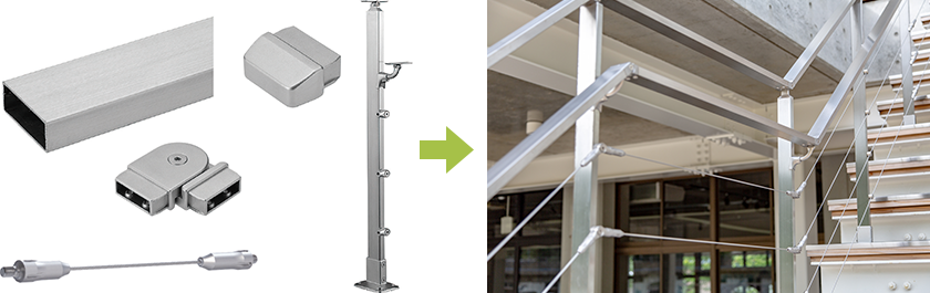 パーツ単体で納品、現場で組立施工する自立式ステンレス手摺です。ステンレスへのこだわりと高度な加工技術にデザインが融合し、機能美を備えた製品ラインアップを生み出しました。