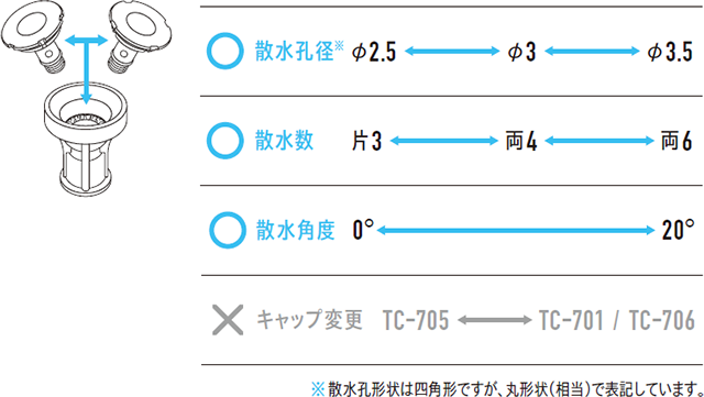 | 散水数 | 散水角度 | 散水孔径(φ)(mm) | 接続口径(φ)(mm) |
